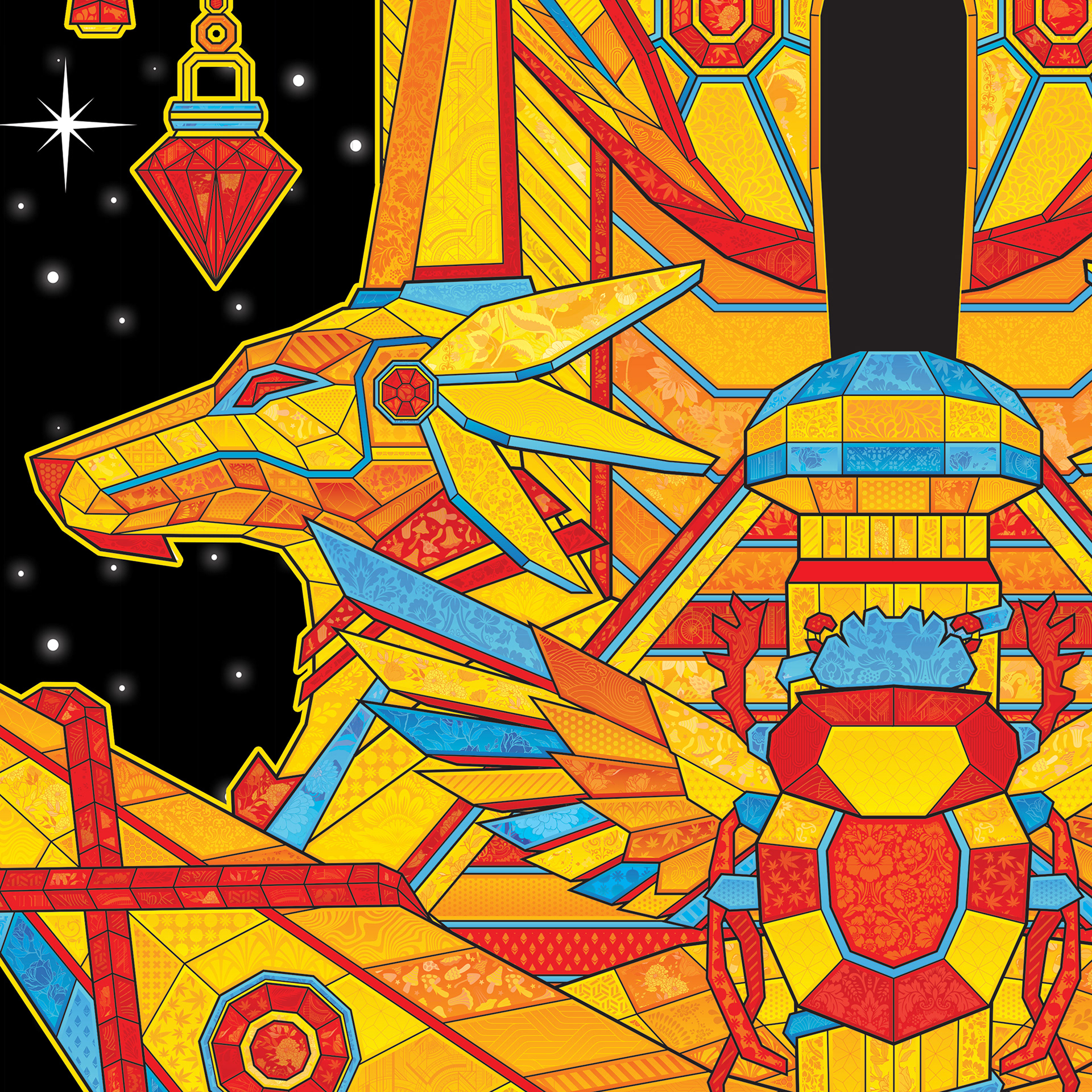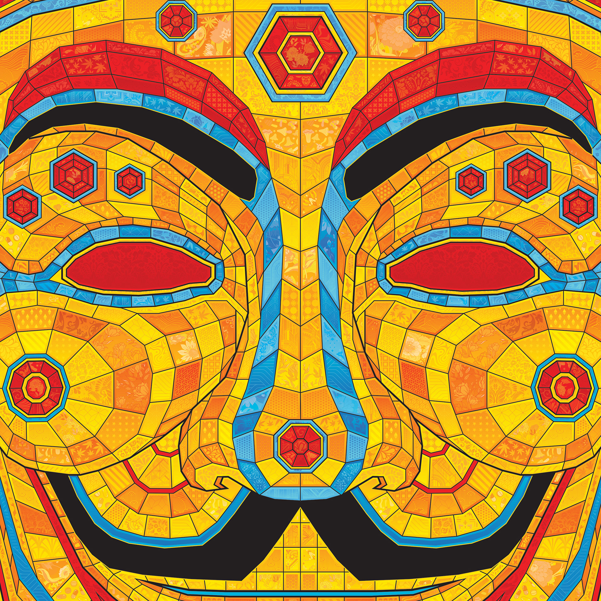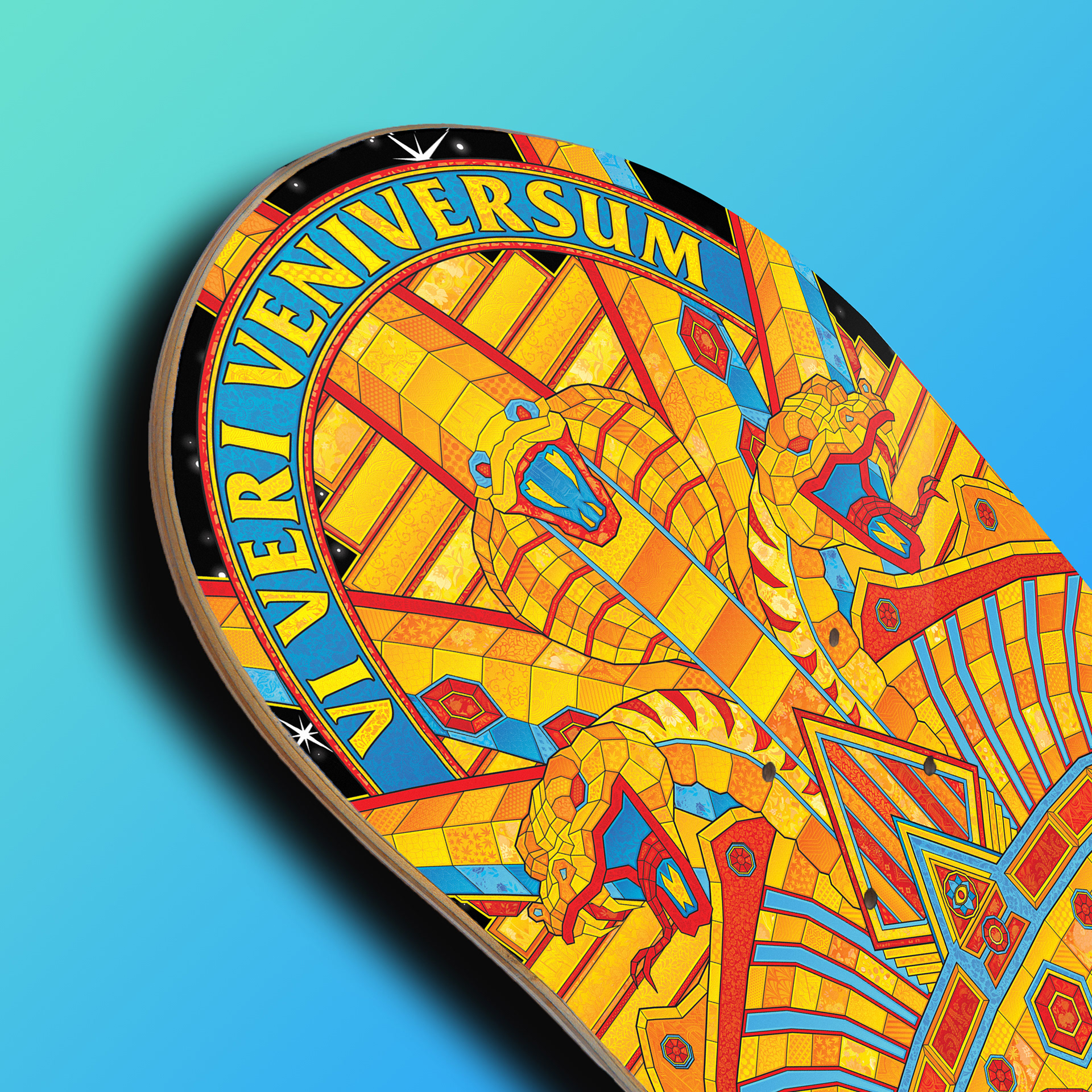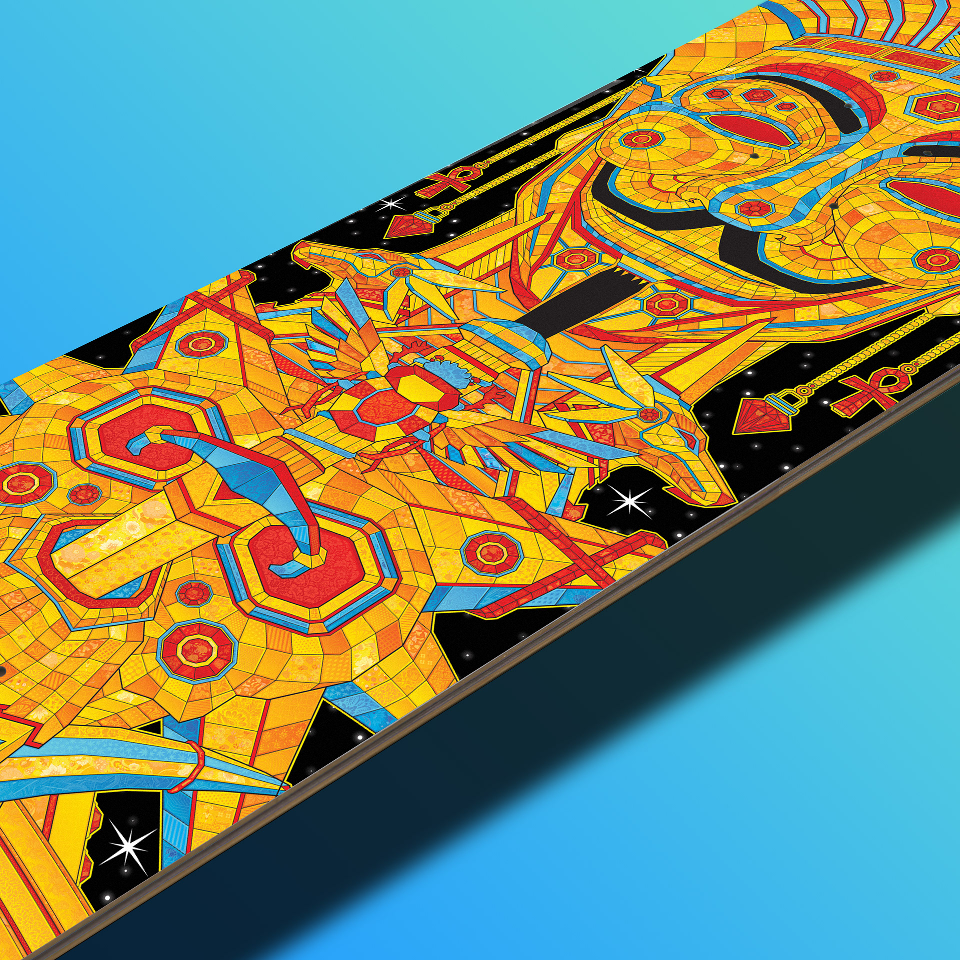Geometric Guy Fawkes skateboard design with an Ancient Egyptian spin